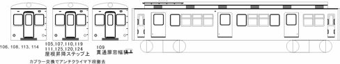 | 準備中 | 京成105更新 | ![]() 多数派。屋根昇降ステップの位置が違うので前面は選択可能。 別途必要:パンタ、ヘッドライト、テールライトレンズ、下回り(台車、床板、床下機器、動力)など |